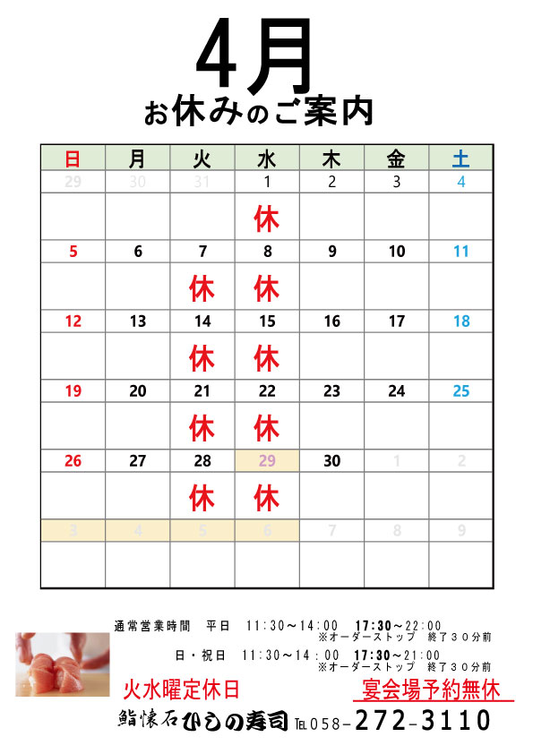 2026年4月定休日